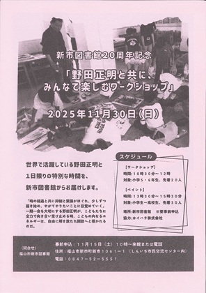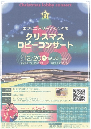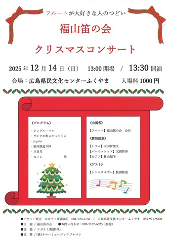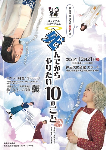 福山笛の会 クリスマスコンサートU-Q革命 オリジナルミュージカル 死んでからやりたい10のことエフピコアリーナふくやま クリスマスロビーコンサート福山市新市図書館20周年記念「野田正明とともに、みんなで楽しむワークショップ」