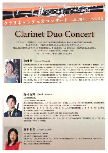 今回は広島で活躍するクラリネット奏者高西望さん、野村友輝さん、そしてピアニストの森木和美さんをお招きし、オールクラリネット二重奏プログラムでお届けします。