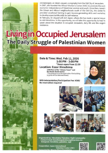 エルサレム旧市街出身の考古学者、アビール・ザイヤードさん。彼女は2007年、パレスチナの女性や育少年の社会的経済的自立をめざし、AWC(アットウーリー女性センターAthouri Women's center)を立ち上げました。以後、旧市街南に位置するシルワーン地区とアットゥーリー地区を拠点とし、収入獲得手段を得るための職業技術訓練、自立に必要なライフスキルを身につけるための研修などを実施しています。このたび来日が決まったアビールさんは、広島への訪問も希望されました。占領下のエルサレムの状況と日々の暮らしや抵抗について、この機会にアビールさんからじっくりお話を伺います。